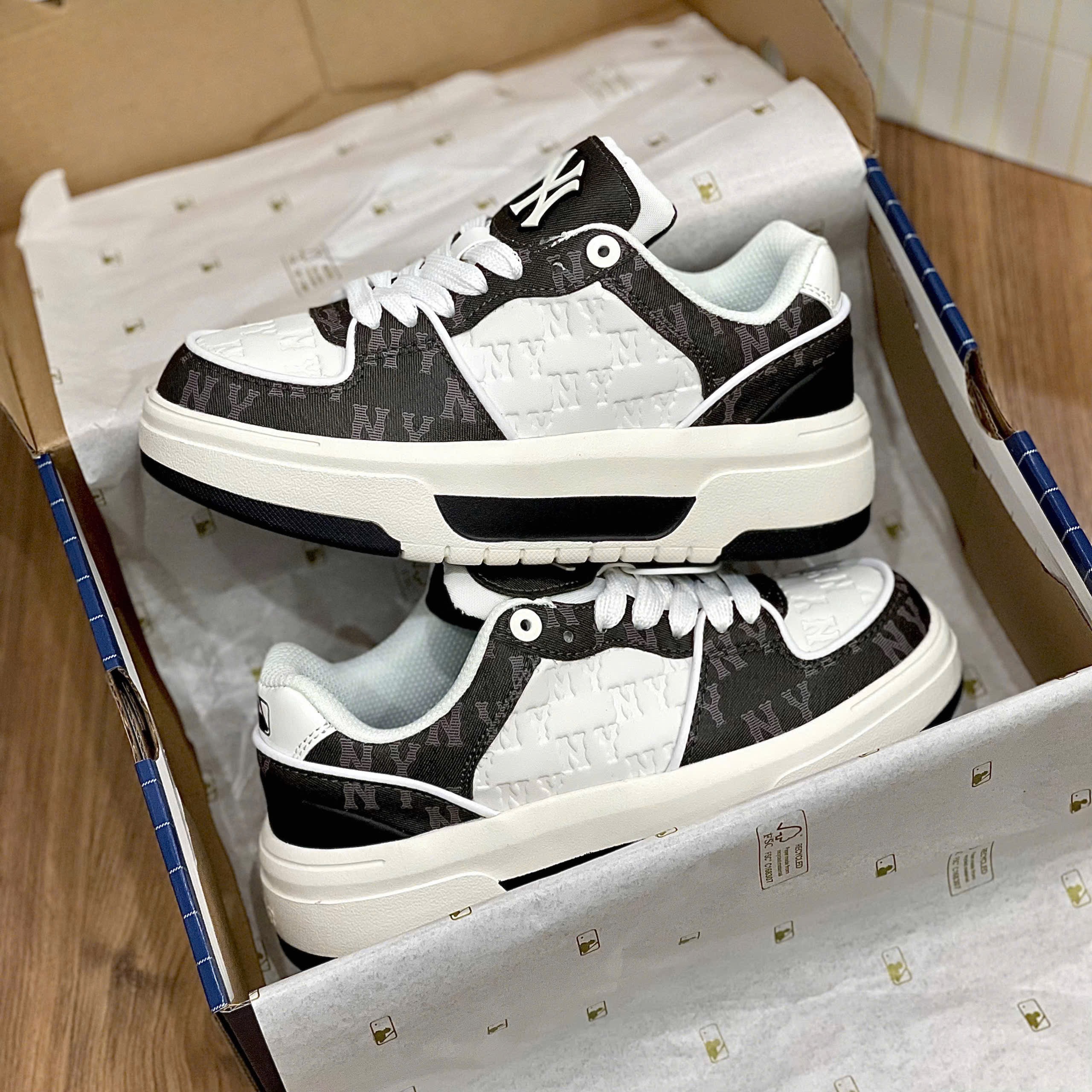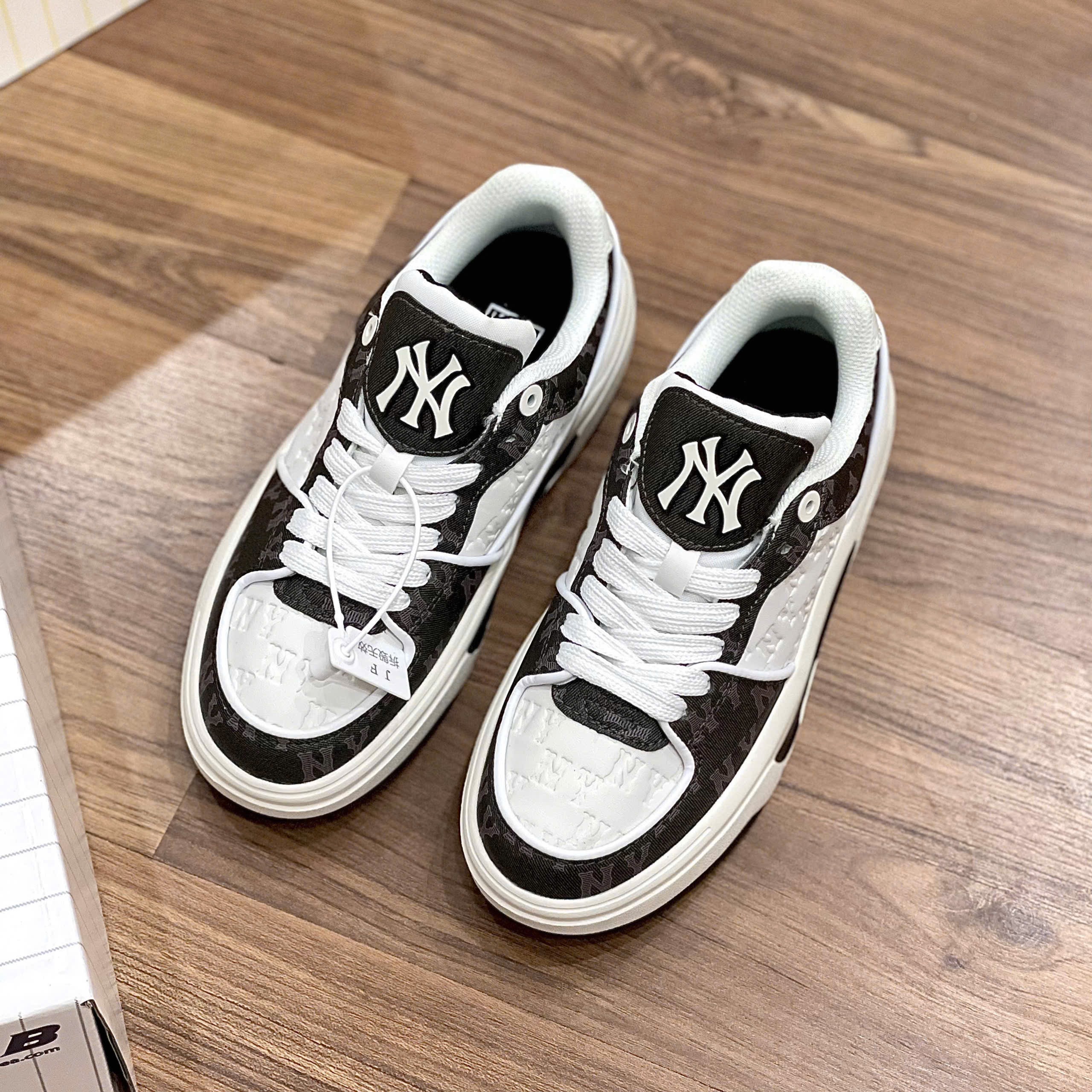Phiên bản Monogram Black là “trùm cuối” về độ sang chảnh. Thay vì da trơn đơn điệu, các mảng da trên thân giày được in họa tiết Monogram NY chìm, tạo hiệu ứng thị giác đẳng cấp, giống như các thương hiệu thời trang xa xỉ (như Gucci hay LV). Đây là đôi giày dành cho những ai muốn mình là tâm điểm của sự chú ý.